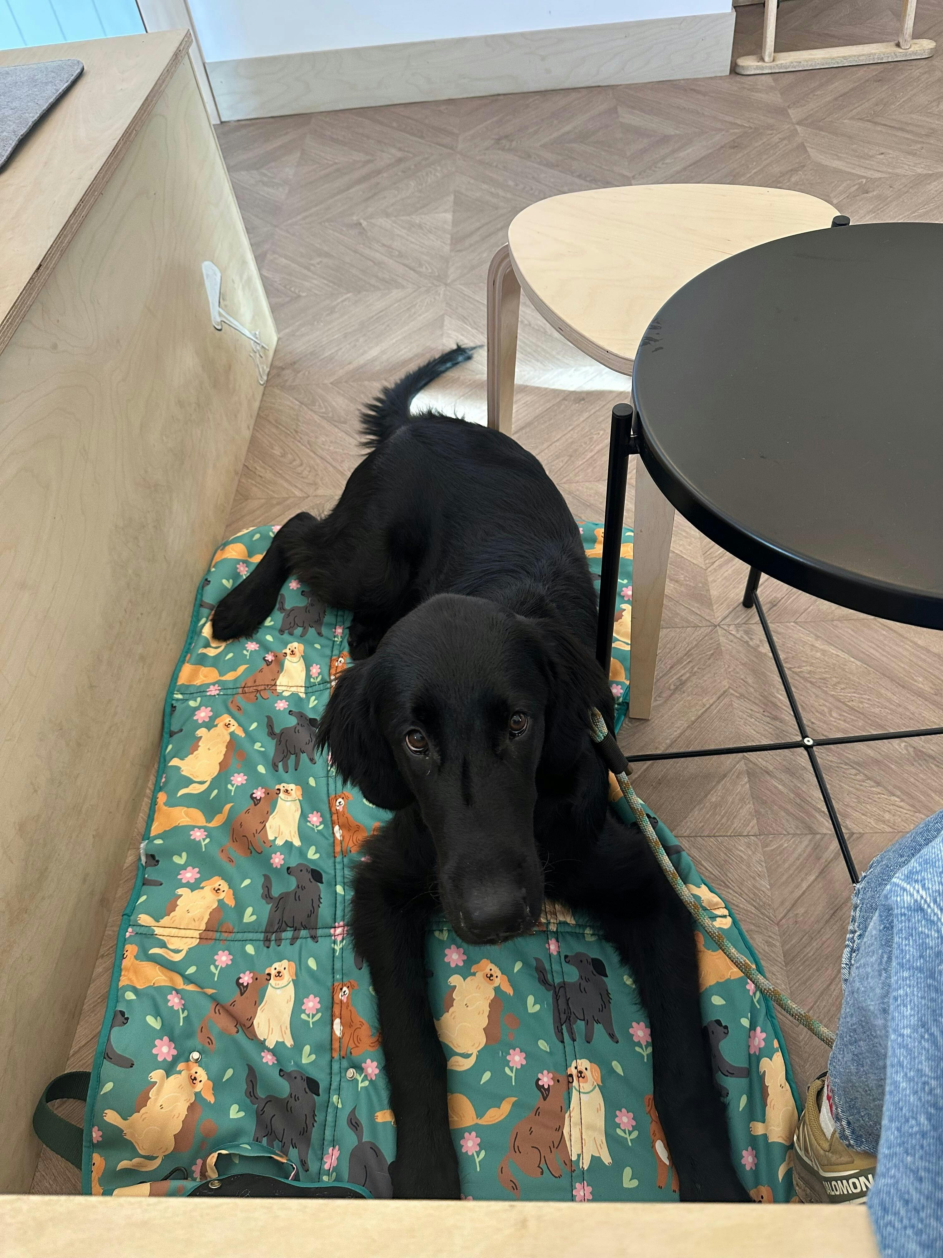We love our settle mats!! This one is just the sweetest print for our flat coated retriever - he loves chilling on it when we bring him places!
